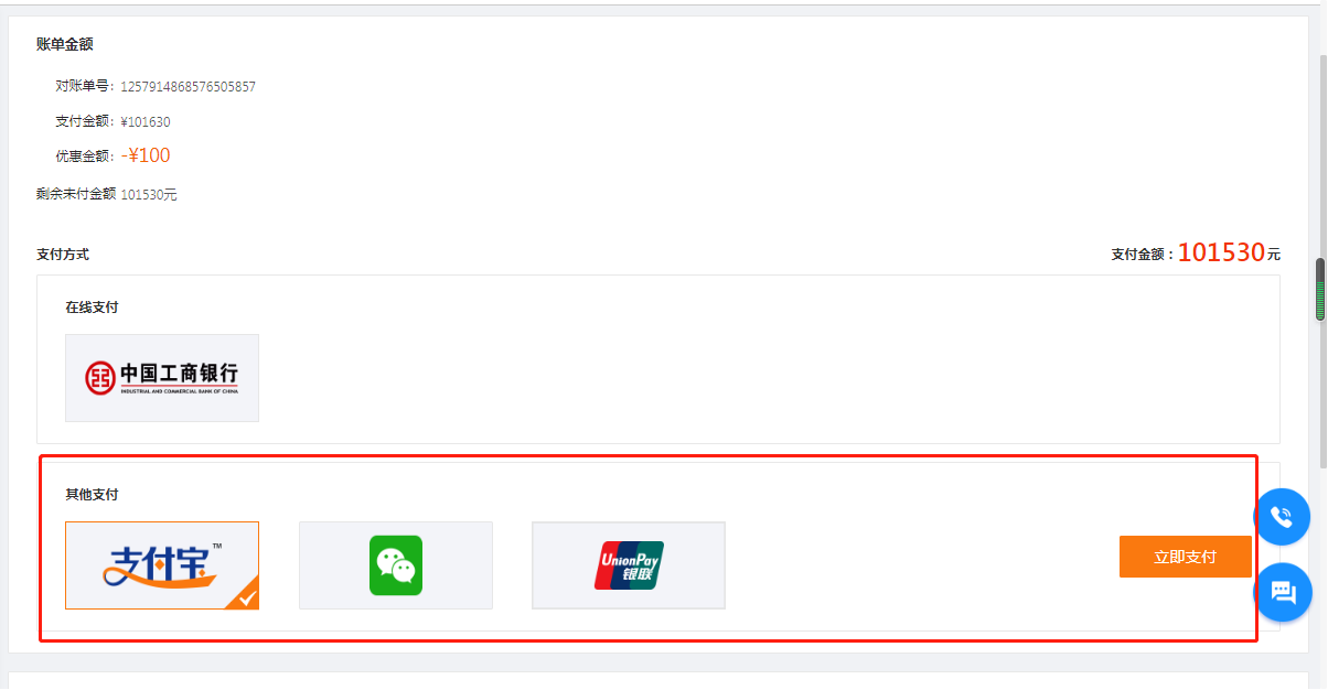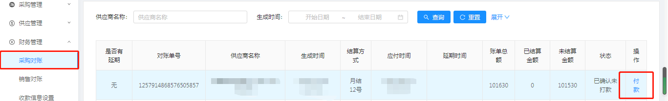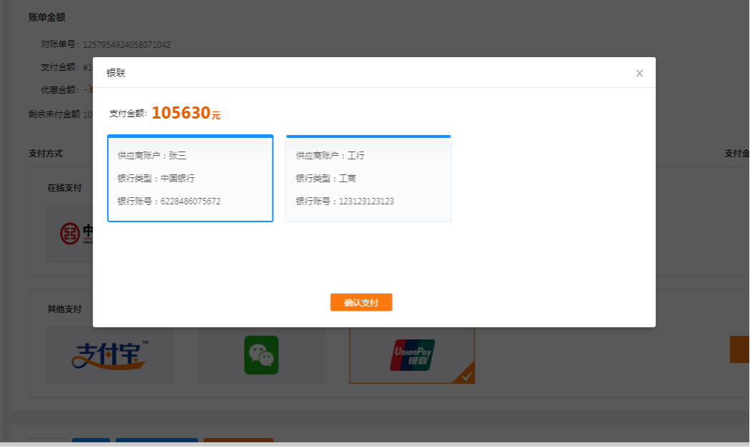 线下转账教程 第一步 在左边菜单栏点击采购对账,选择应付的账单点击付款。 第二步 选择需要支付的线下支付的方式点击立即支付,目前支持支付宝、微信、线下银行转账。 选择微信或者支付宝支付,扫码付款上传凭证,上传完成后点击完成支付,等待供应商收款审核。 线下转账完成后,上传付款凭证点击完成支付,等待供应商收款审核。