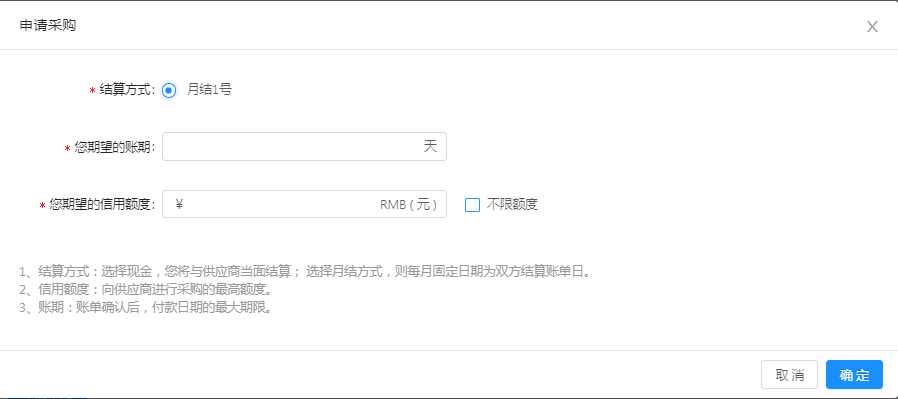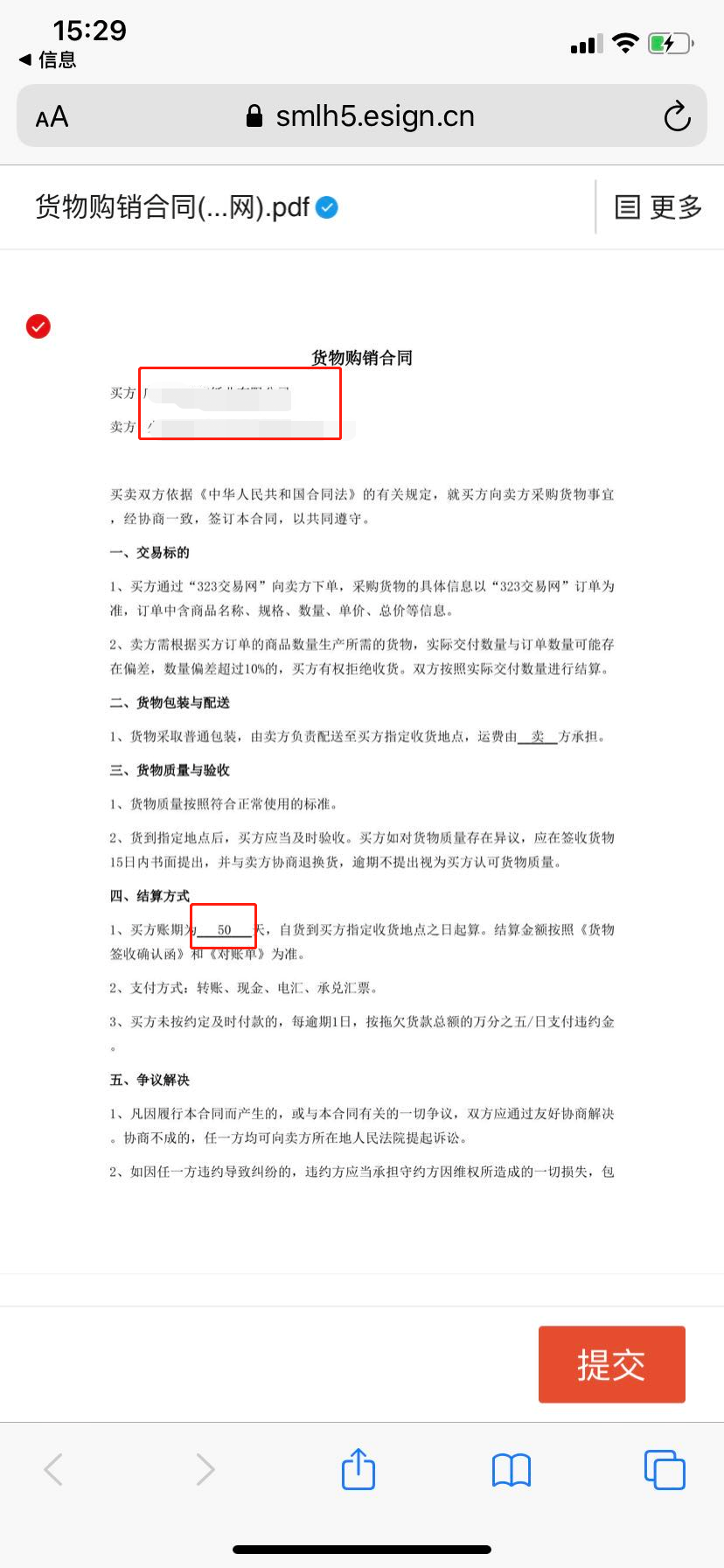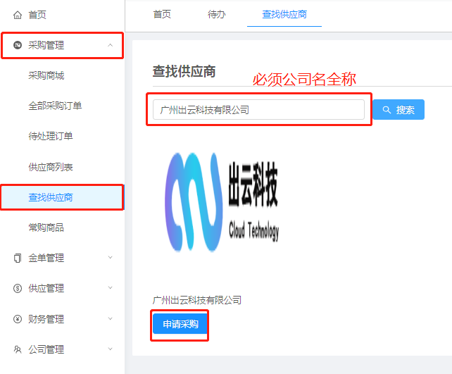 采购申请 第一步 点击左边菜单栏--点击采购管理--点击查找供应商,搜索出需要申请采购申请的供应商的全名,点击申请采购/重新申请采购。 第二步 填写相关结算信息、账期信息,点击提交等待供应商审核。 采购合同签署 第三步 待供应商审核通过,将会收到一条购销合同签署短信,点击进入短信提供的网站。 第四步 确认信息,签署购销合同,采购协议达成,可以向供应商下单(特别注意需要确认下账期是否双方约定账期以及买卖双方),确认无误后点击提交即可。