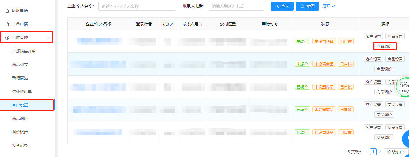 点击左边菜单栏--点击供应管理--点击客户设置,查找出需要改价的客户信息栏并在其操作栏下选择商品调价。