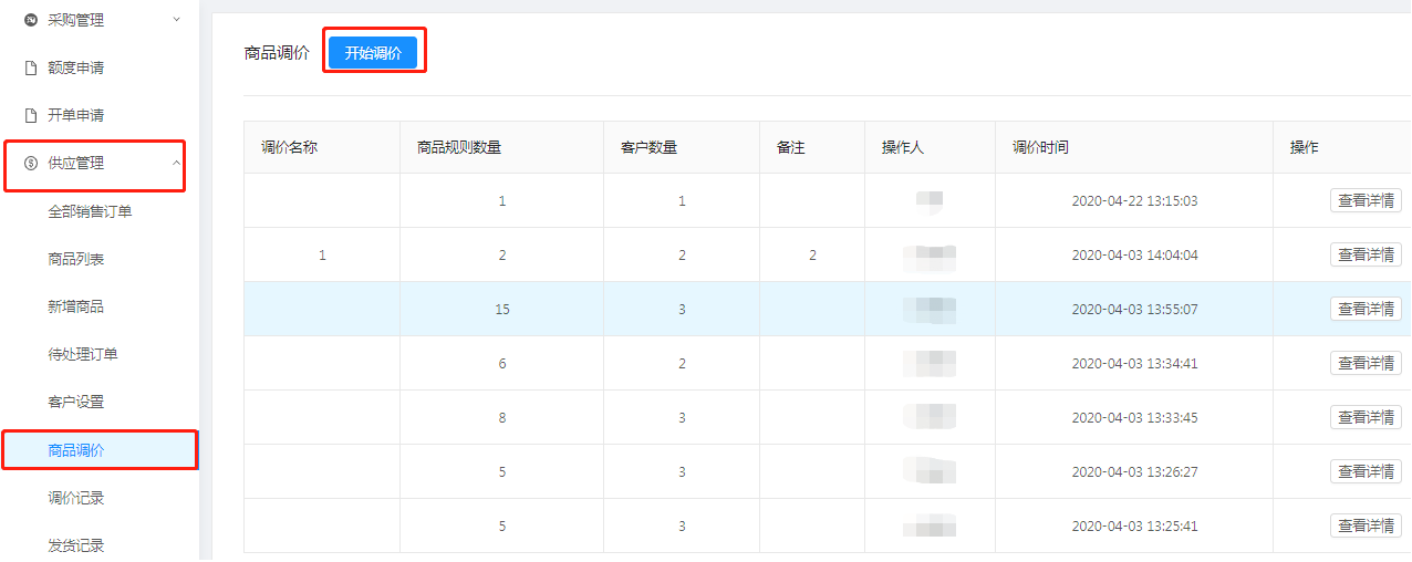 点击左边菜单栏--点击供应管理--点击商品调价--点击开始调价。