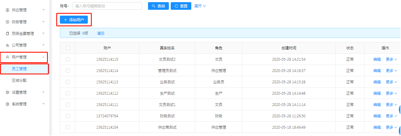点击左边菜单栏--点击用户管理-点击-员工管理--点击添加用户。