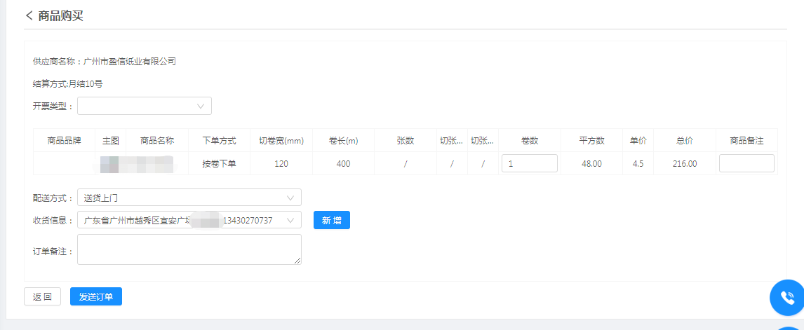 采购商下单 您的浏览器不支持 video 标签。 第一步 进入供应商商城①点击最上方菜单采购商城②点击左边菜单栏--点击采购管理--点击采购商城点击选择的供应商进入其商城 第二步 选购商品,点击商品进入商品详情。 第三步 填写需要下单的规格,点击立即下单(注:需要包卷切张客户需要勾选是否切张按钮,切张按钮默认不开启)。 第四步 确认信息(地址信息,开票信息也可以在此新增),发送订单,确认信息无误后点击发送订单即下单成功(注:发送订单成功也会在通知提醒)。 查询订单信息 点击左边菜单栏--点击供应管理--点击全部销售订单。