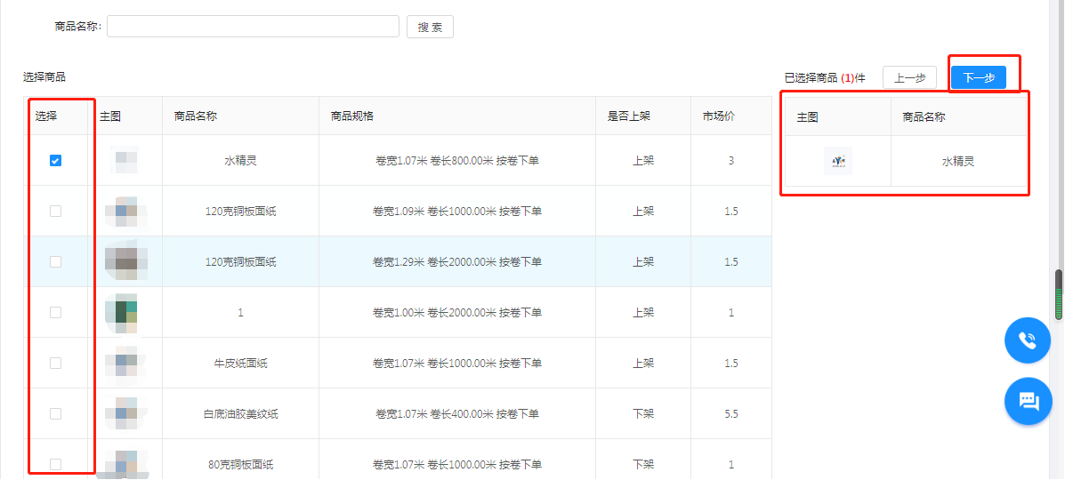 查找出需要改价的商品并勾选出商品,已勾选商品会显示在右边勾选栏中,点击下一步。